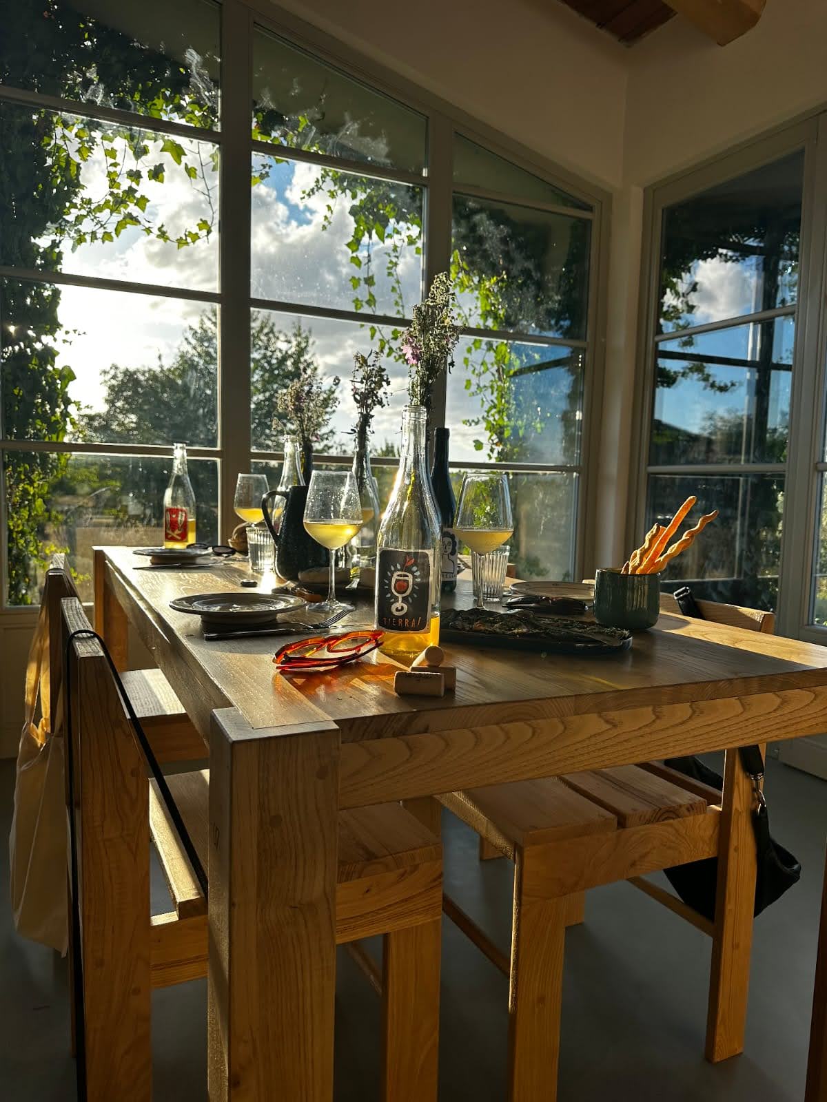The farm's history runs deeper than its visible layers. "Old Etruscan tombs below ground have been repurposed as cellars, allowing the wines to age in naturally cool, stable conditions that are both practical and evocative of the territory's ancient layers." The renovation above ground followed the same respect for what was already there: local artisans, recovered original terracotta floors, lime-based mortars, materials from small regional workshops. Heating comes from wood combustion using timber from the property. Solar panels cover most of the electricity needs. The farm stays close to energy self-sufficiency while remaining grid-connected - a practical balance that reflects how Elisa and Giovanni approach most things: with clear values and without dogma.